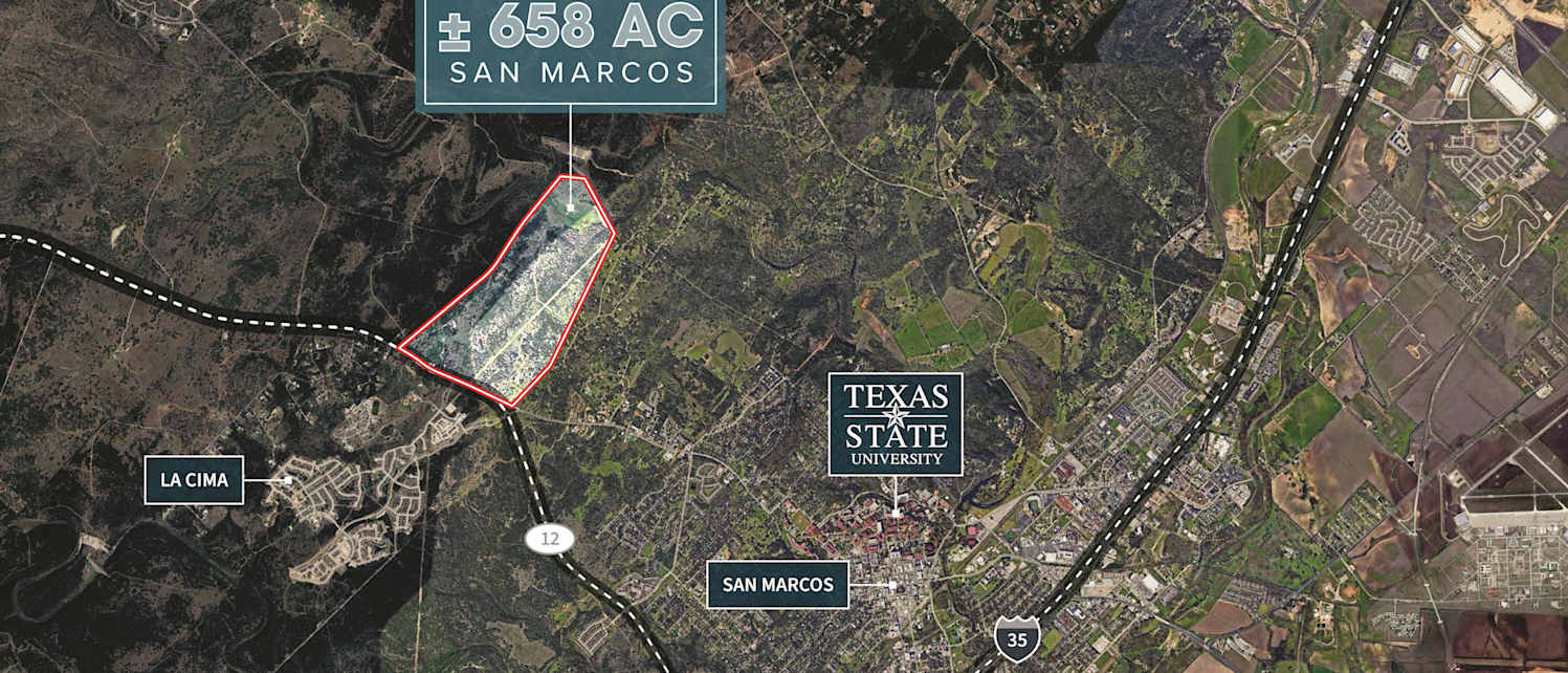 Jones Lang LaSalle (“JLL”), on behalf of the owner, is pleased to present ± 658 Acres in San Marcos, TX (Austin MSA). The Property is located on the west side of I-35 on RR 12, the main thoroughfare connecting San Marcos to Wimberly, TX through the beautiful Texas Hill Country. The Property is fully entitled and has a legislative MMD in place that funds public infrastructure. San Marcos has one of Texas’ largest universities, Texas State, that holds almost 45,000 enrolled students. The 658 acres is an ideal development opportunity to take advantage of the continued booming growth in Central Texas.