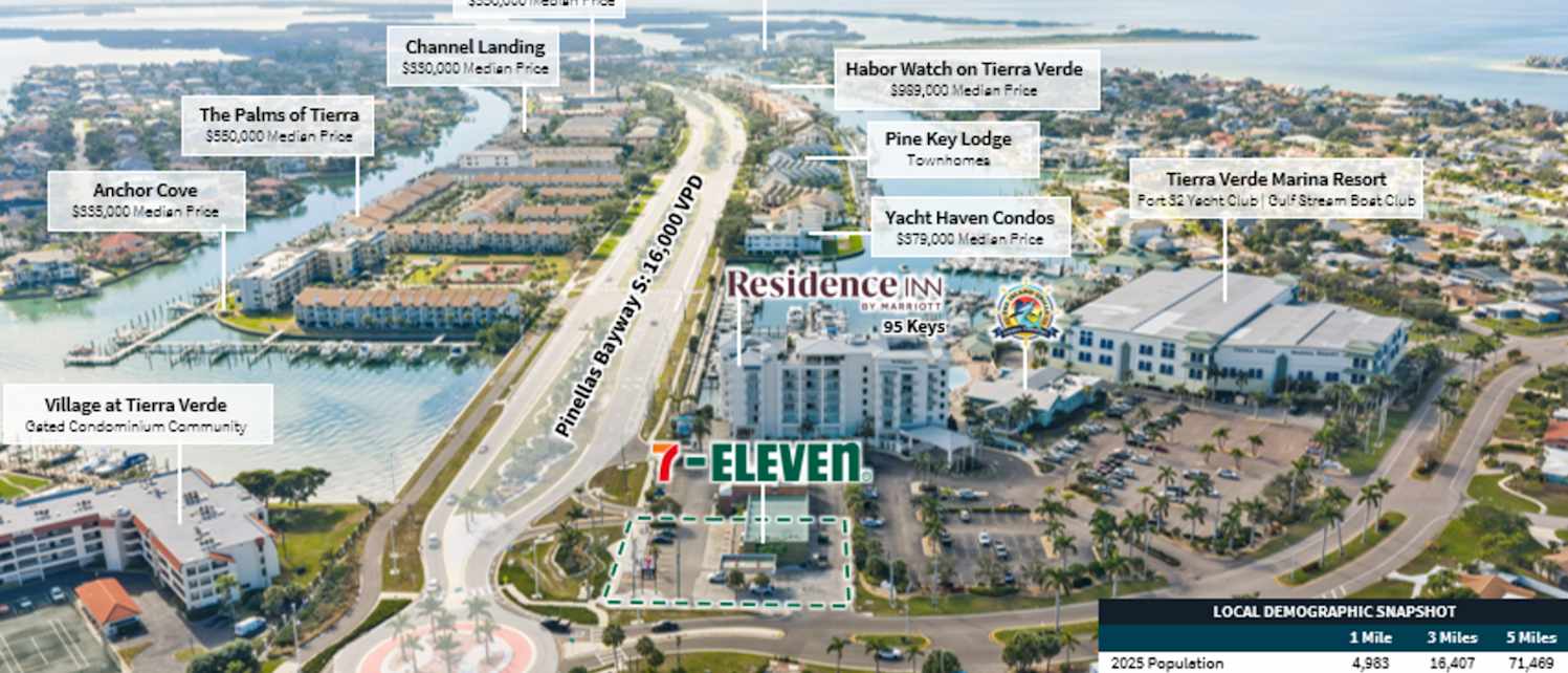Jones Lang LaSalle Americas, Inc. (“JLL”) is pleased to offer the opportunity to acquire the fee simple interest in the 7-Eleven located at 150 Pinellas Bayway S in Tierra Verde, Florida (“Property” or “Asset”). 7-Eleven is operating on a long term, 15-year absolute NNN lease with zero landlord responsibilities and 10.0% rent increases starting in year 11 and continuing at each of the five, five-year renewal options.
