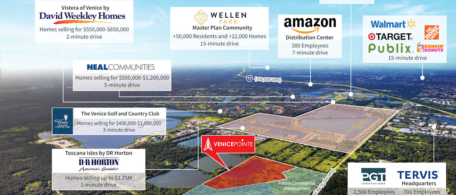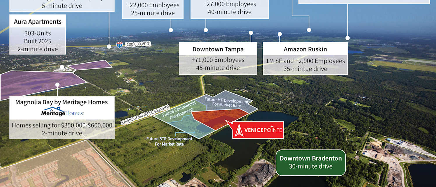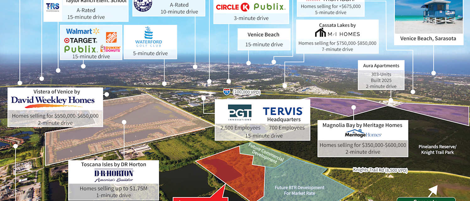 JLL is pleased to present the opportunity to acquire Venice Pointe (the “Property”), a ±39.8 gross acre site (consisting of ±29.5 upland acres) located within the rapidly growing and affluent city of Venice, FL (Sarasota MSA). Venice Pointe is located on the highly visible Knights Trail Road (8,500 VPD), in an upscale neighborhood where new-construction townhomes are selling in the $400,000-$500,000 range. The Property is within the San Marco PUD and has zoning allowing for a maximum density of ±13.6 units per acre. Seller has prepared two conceptual site plans for the development of: i) 308, 16’ and 24’ wide townhomes with 1- and 2-car garages and ii) 308, 20’ wide townhomes with 1-car garages. Seller will deliver to buyer a shovel-ready site (paper lots) by Q2 2025, based on the buyer's selected site plan.