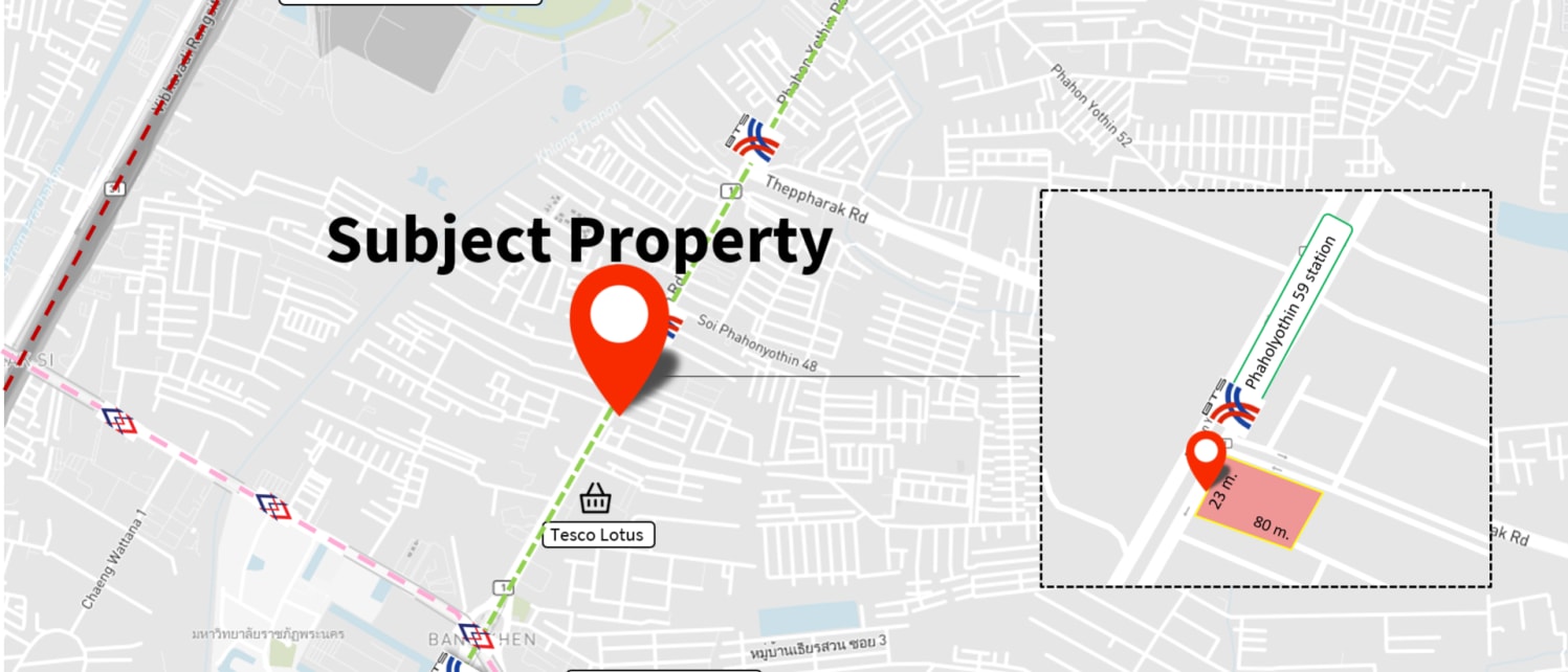 This land is located on Phaholyothin Road, next to BTS Phaholyothin Station and close to MRTA Wat Phra Sri Mahathat Station (Pink Line), an interchange station which connects to the MRTA Green Line, and runs from Nontaburi to the east of Bangkok (Minburi). The land is easily accessible via Ram Intra Road, Chaeng Wattana Road, and Vibhavadi - Rangsit Road.