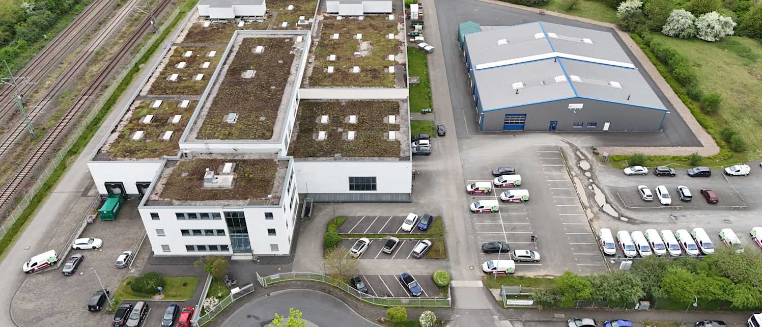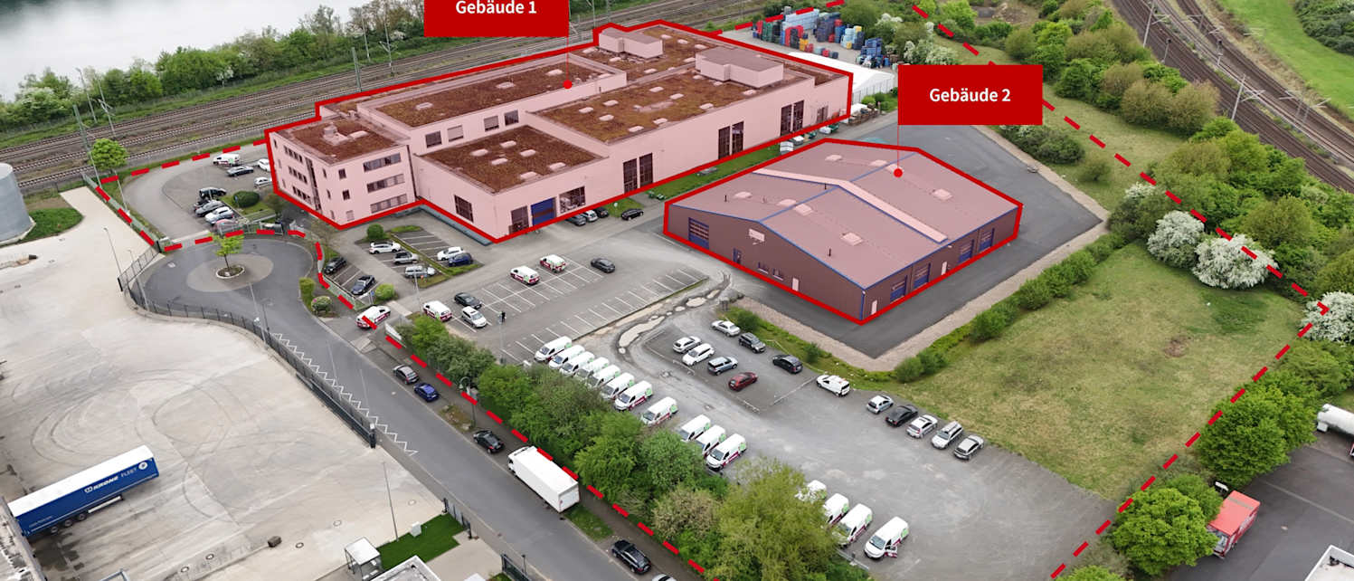 The property at August-Horch-Strasse 10 in 51149 Cologne-Porz is in an ideal location and has excellent connections. The property is located in the middle of the “Airport-Businesspark Cologne-Porz-Gremberghoven” industrial area, which is characterized by its extremely advantageous location in the immediate vicinity of Cologne-Bonn International Airport. There are two buildings on the approx. 26,000 sqm site. Building 1, the former print shop, was built in 1996 and is currently used by Flaschenpost. Building 2 was built in 2012 and is used by Rheinisches Anzeigenblatt. Both buildings comprise a total of approx. 7,000 sqm of warehouse area and approx. 1,800 sqm of office area.