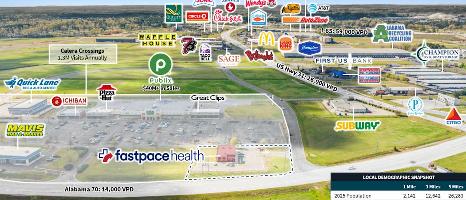Jones Lang LaSalle Americas, Inc. (“JLL”) is pleased to offer the opportunity to acquire the fee simple interest in the single-tenant Fast Pace Health Urgent Care at 332 Marketplace Circle in Calera, Alabama (“Property” or “Asset”). The Property is operating on an absolute NNN lease with ±13.6 years of primary lease term remaining, 2.0% annual rent escalations and three, five-year options.