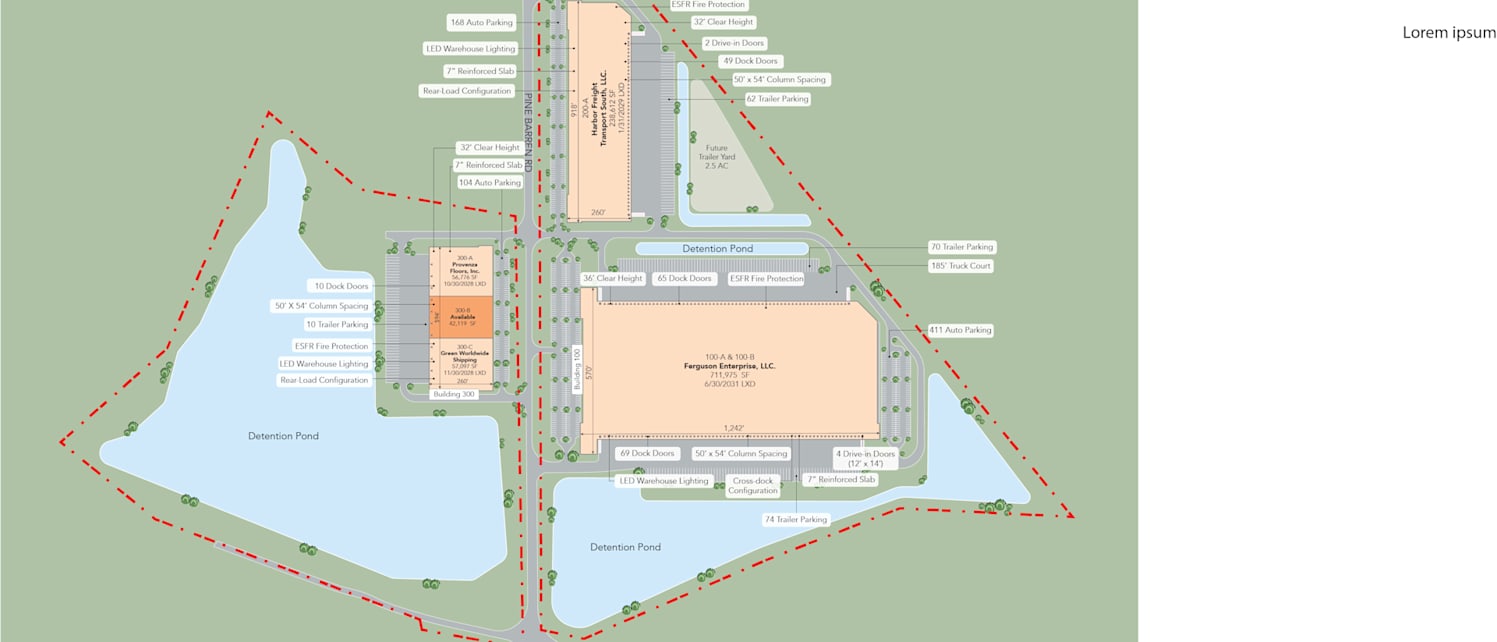 Building 200 - 238,612 square feet - 100% occupied Harbor Freight Transport with 3.1 years of term remaining and 3.75% annual escalators. The building features a rear load configuration with 3 store fronts and can be easily converted into a multi-tenant building in the future.